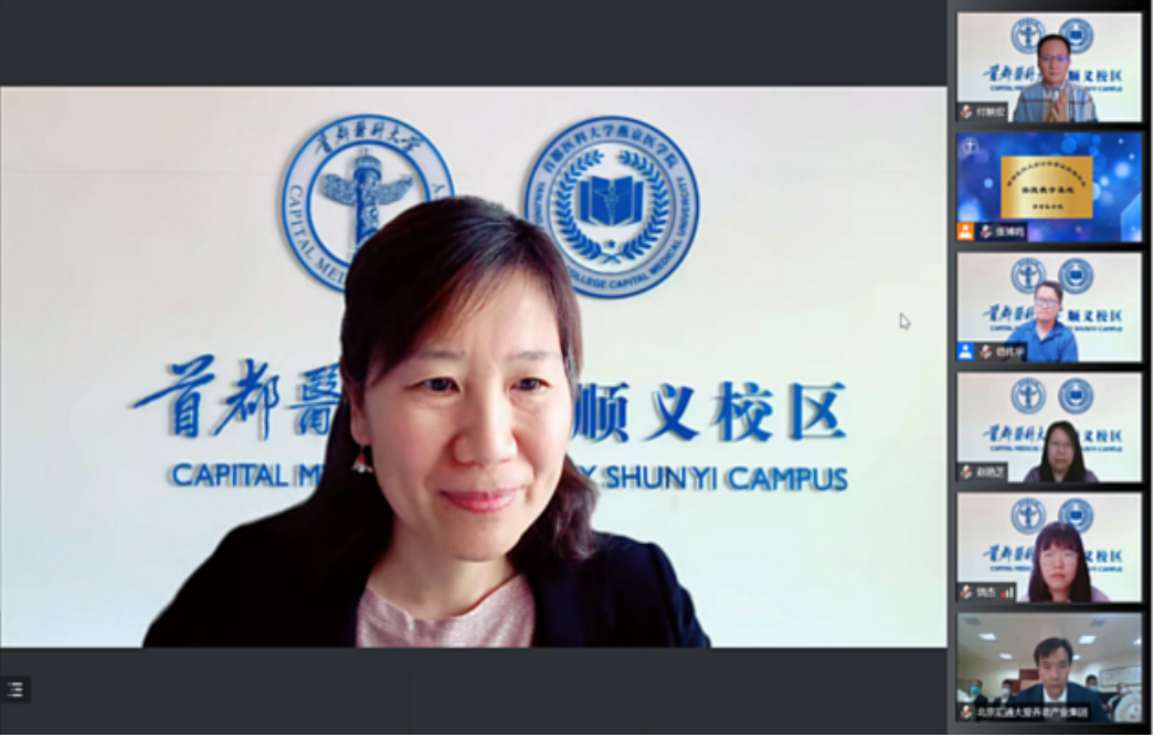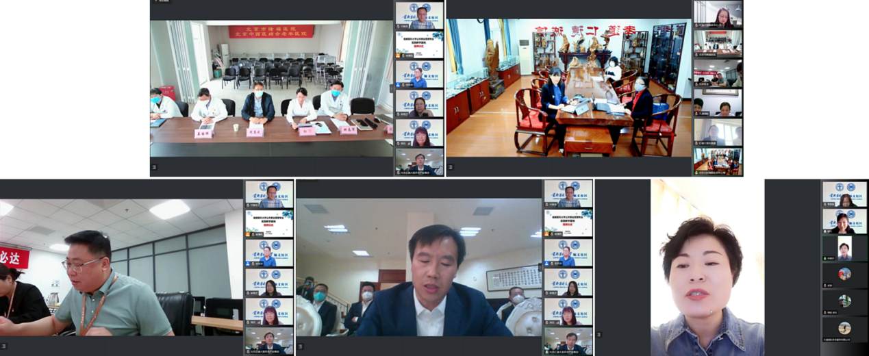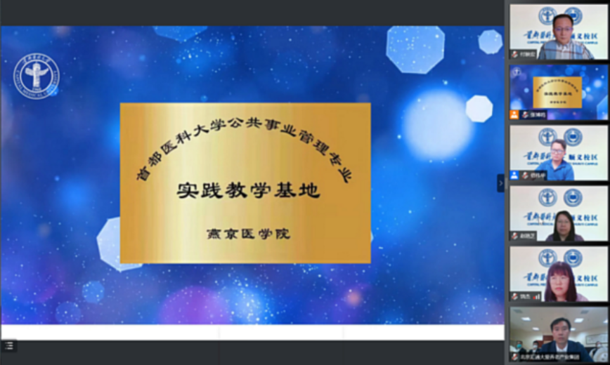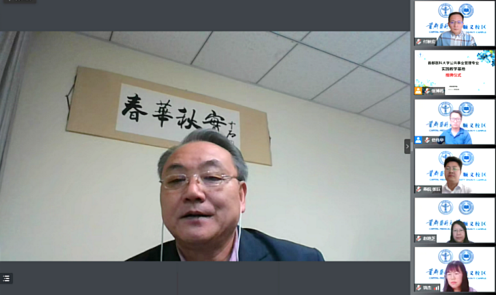 5月17日,我院二年制公共事业管理专业实践教学基地授牌仪式通过线上的方式举行。学校副校长王松灵院士、教务处处长武艳、副处长朱淼、东城区卫生健康委副主任周英武出席了仪式。参加本次线上授牌仪式的基地主要领导有北京市隆福医院姜国栋书记、彭堃院长,北京九华养老服务有限公司徐进副总经理,北京汇通大爱养老产业集团赵国良总经理、郭遐副总经理,北京寿山福海投资发展集团有限公司孙艳芬副总经理,北京太阳城银龄老年公寓崔又双总经理,学院党委副书记赵艳芝,预防医学学系和教学办的相关负责人等参加了签约仪式。仪式由学院杨红院长主持。