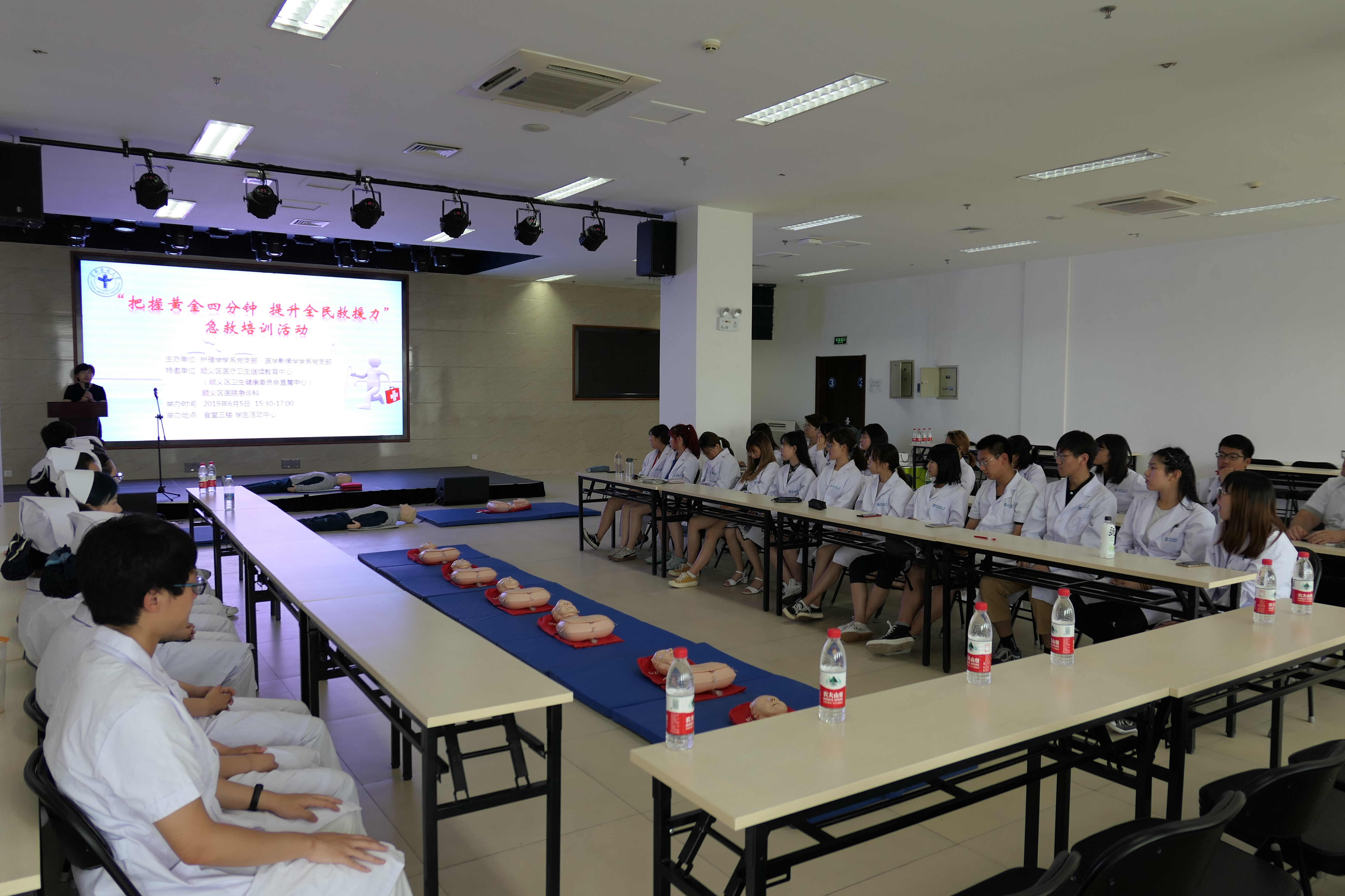 为提高学生应急救护能力、掌握急救技能,2019年6月5日,Hanime1 医学影像学学系和护理学系联合开展了“把握黄金四分钟,提升全民救援力”急救培训活动。学院特邀顺义区医疗卫生继续教育中心(顺义区卫生健康委员会直属中心)和顺义区医院急诊科团队为师生讲解急救知识。学院副院长赵艳芝,顺义区医疗卫生继续教育中心主任臧海霞,顺义区医院急诊科主任陈学和,护理学系、医学影像学学系师生参加了培训。