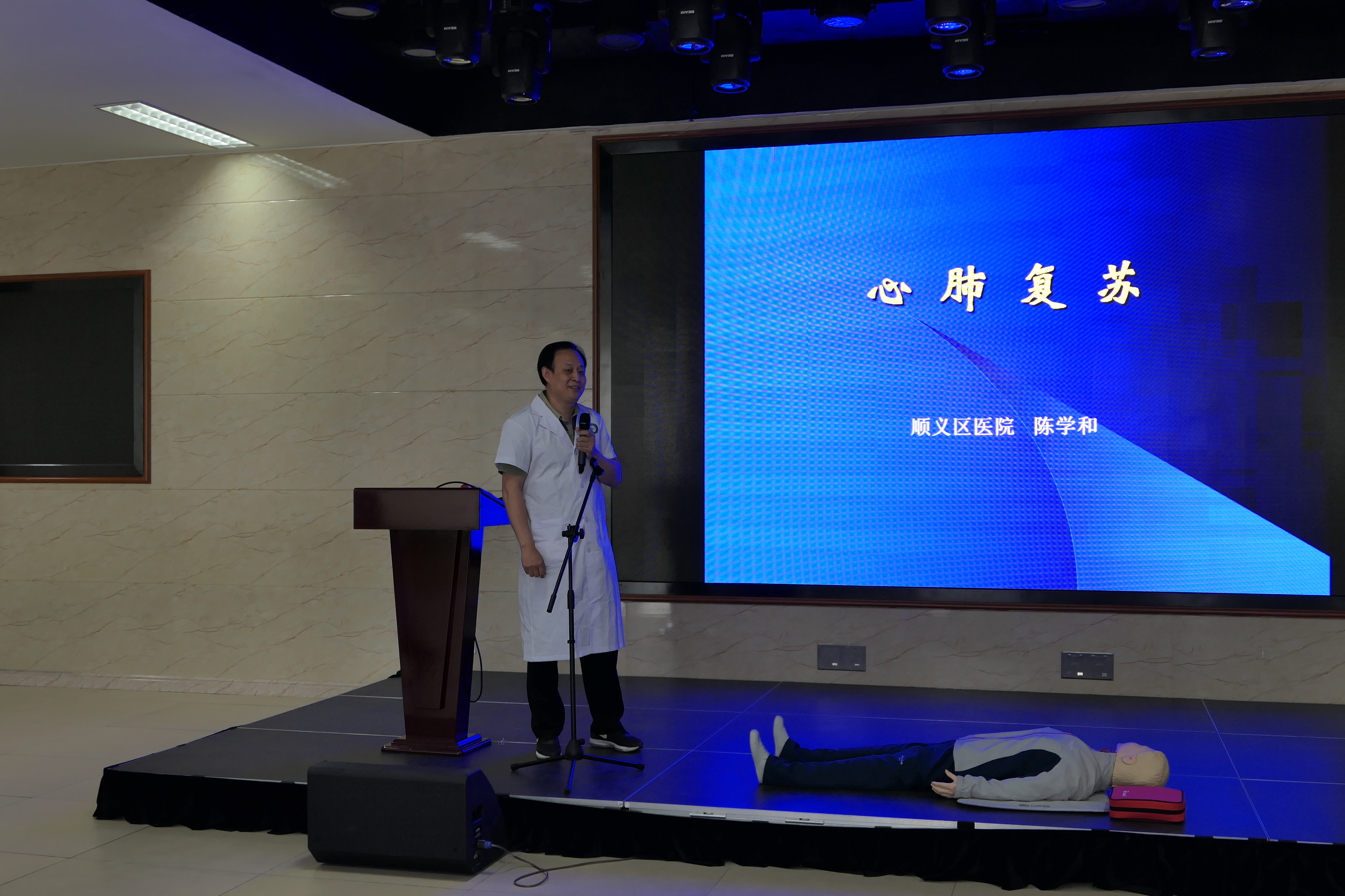 本次培训活动由顺义区医院急救中心主任陈学和老师主讲,他介绍了心搏骤停的原因和临床表现,详细讲解心肺复苏的全过程,不仅结合实际的急救案例,还图文并茂地向师生们展示了心肺复苏每个步骤中的注意事项。陈主任特别强调,在紧急救护过程中,“时间就是生命”,对于患者而言,尽快地得到有效的救助是关键。