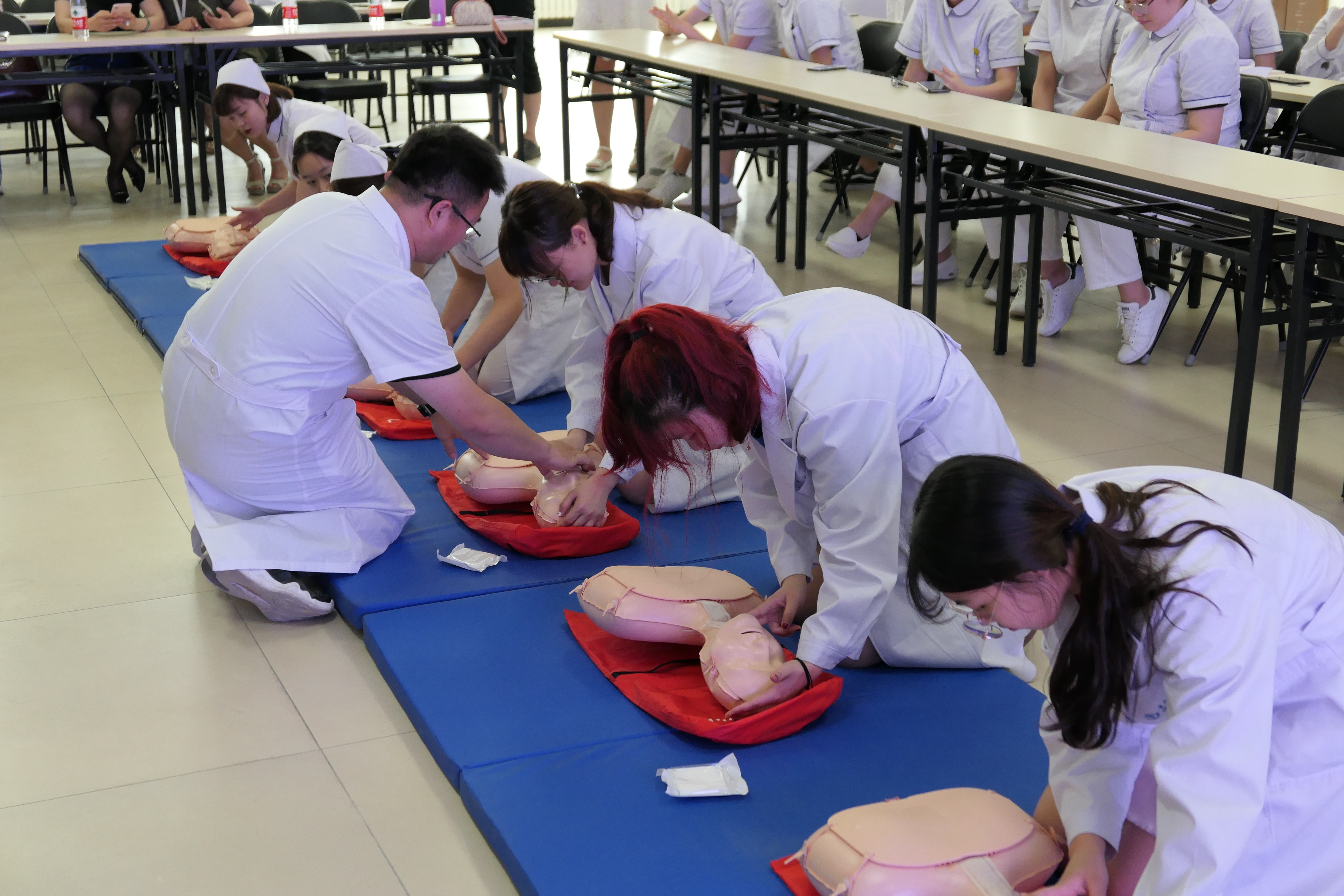 培训中还进行了现场模拟紧急救护场景,在老师们的指导下,学生分组进行实际演练。从“确定急救环境安全”到“调整体位进行心脏按压”,从“进行人工呼吸”到“判断病人意识恢复”,当同学们动作规范标准,成功完成 “施救”后,全场响起热烈掌声,大家感受到挽回一个生命带给自己的成就感。