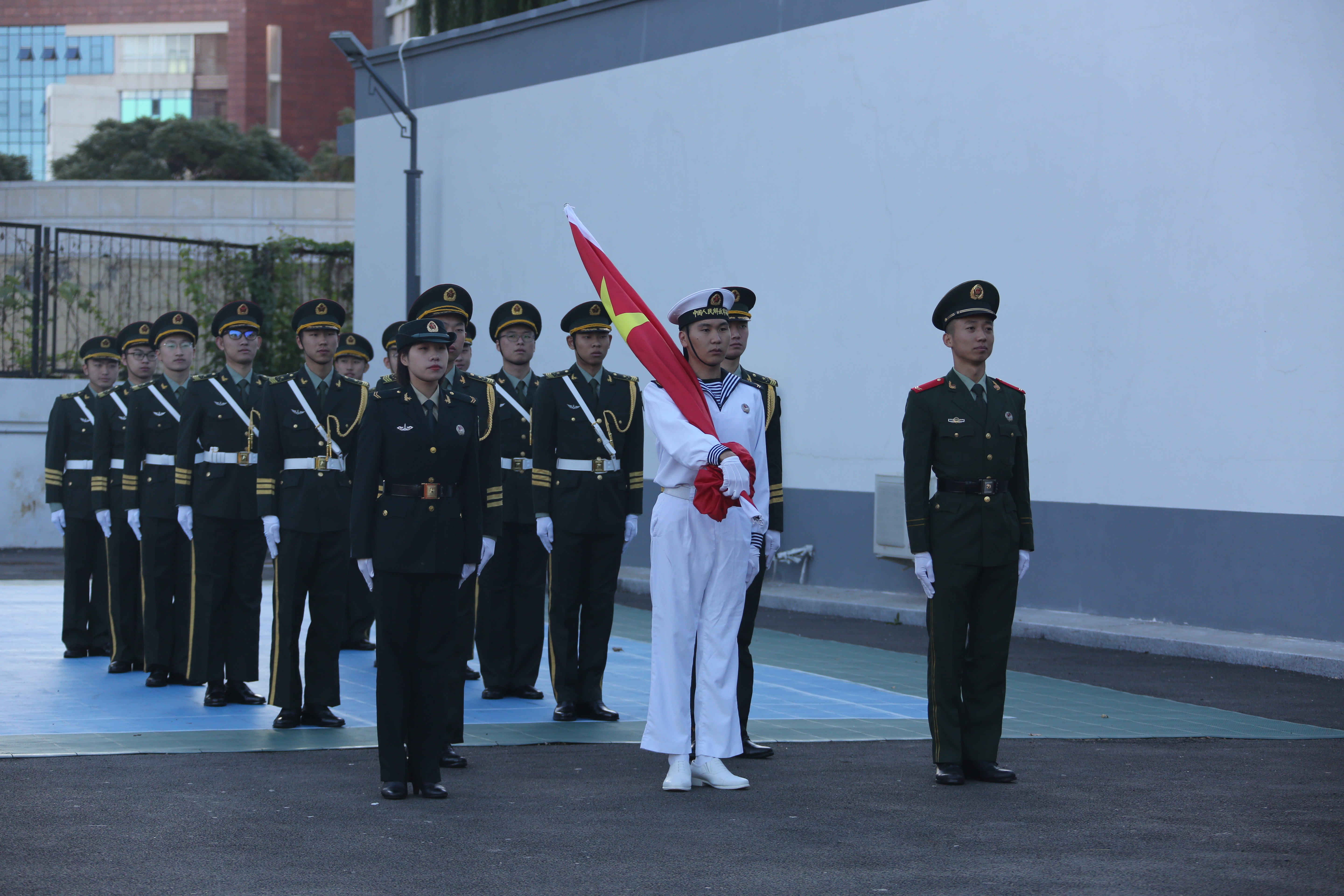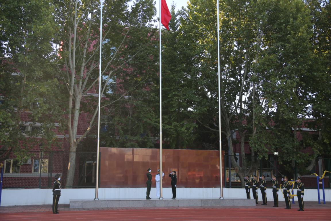 10月8日,Hanime1 2019级全体军训学生在操场举行升国旗仪式。学院党委书记吴兵、院长杨红、党委副书记、军训团副政委崔群颖、军训团其他教师和610余名大一新生共同参加了升国旗仪式。