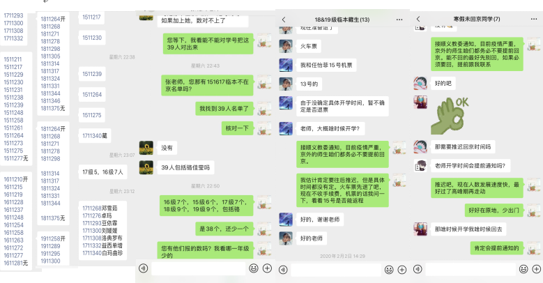 “1月23日,在接到顺义区教委和学院要求统计学生离京返京情况通知后,各学系党支部书记和所有辅导员老师,大家通过微信、电话一对一联系核实,分工落实,直到凌晨1点多才完成前期台账汇总。2月6日,接到学校6+1表格填写任务,学院全体辅导员从上午9点开始逐一核对相关学生数据,一直到下午5点才完成核对工作。”学生办公室负责人张艳辉老师回忆初期防控工作时,特别感谢每一位辅导员的热情配合和辛勤付出。