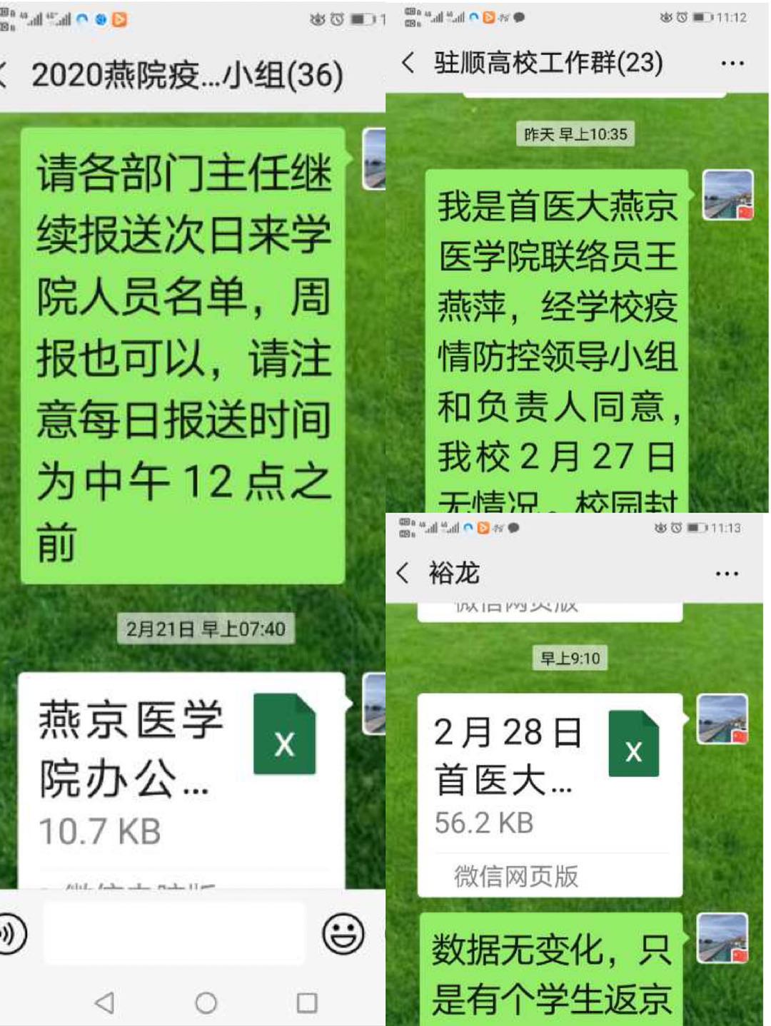 学院办公室在防控抗疫期间的工作也换了“新颜”,除了每天需要逐一核实、统计和上报学院班子成员和科室职员的外出地点、接触人员、身体健康状况等信息,每天统计申请返校教职工的情况报党委审批,报备保卫办公室以外,作为学院联络员,王燕萍老师需要对接顺义区教委,配合属地管理,每天汇总学院最新情况,教职工和学生分类统计最新数据,精准无误地报送给顺义区相关部门,同时做好对顺义区相关部门来院检查接待准备等工作。“疫情期间,院办接到最大挑战的工作是对是离退休人员的摸排。那天下午四点多接到学校通知,主要是逐一核实老同志是否在京,我们只能利用微信群和电话两种方式联系,微信群只有64个人,其他人(116人)都需要打电话进行询问,有的老同志可能需要打几次才能联系上,直到晚上十点多才完成180位离退休职工的第一轮核实工作,第一时间报送给学校办公室”,王燕萍老师提到学院疫情防控工作时说,“这段时间工作最大的不同是需要一直盯着手机、看着电脑,生怕错过一条工作信息,防控没有周末,需要每一天绷着弦儿,及时、细致、真实的核实每一条数据”。