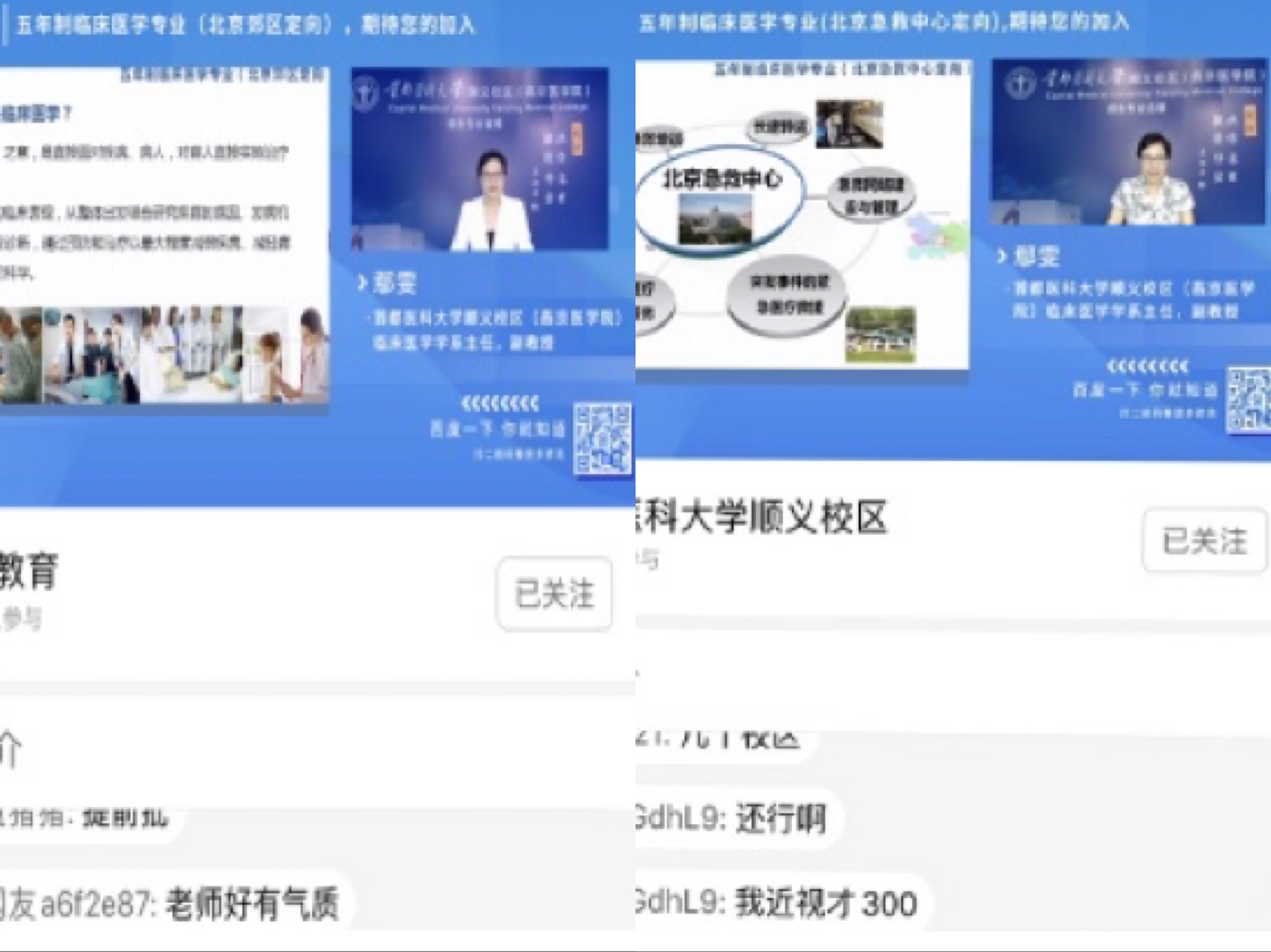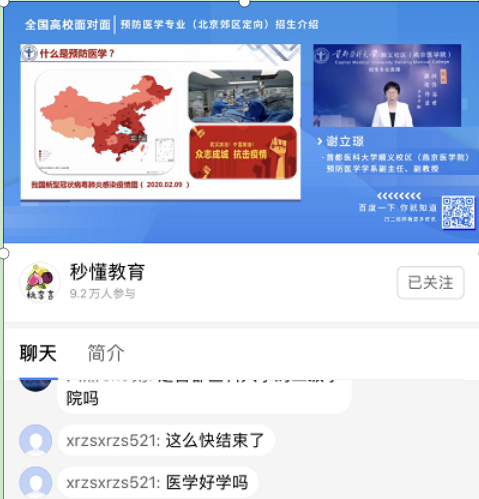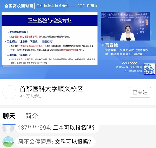 临床医学学系主任鄢雯副教授通过两场直播宣讲就考生及家长关注的专业情况和招生政策从专业特色、课程体系、学科优势、人才培养模式、教学成果、就业情况和专业招生政策等方面对五年制临床医学专业(北京郊区定向)和五年制临床医学专业(北京急救中心定向)进行了全面深入地分析,充分展示了学院的办学理念、办学特色、办学成果和办学实力,帮助考生们全面了解专业定位、培养目标、培养模式、专业建设成效和专业特色,以及作为定向专业,其招生和就业政策的特殊性,让广大考生网友们“亲临其境”地感受到学院风采。