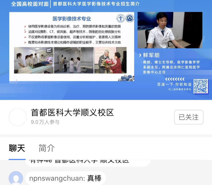 Hanime1 附属北京同仁医院医学影像中心主任、医学影像学学系副主任(兼)鲜军舫教授为广大考生解读了医学影像技术专业2020年最新招考政策,鲜主任就专业简介、师资力量、教学条件、学生风采、就业去向、招生情况及计划六个方面介绍了医学影像技术专业的具体情况。同时,医学影像学学系的老师们在直播评论区为考生及家长答疑解惑。