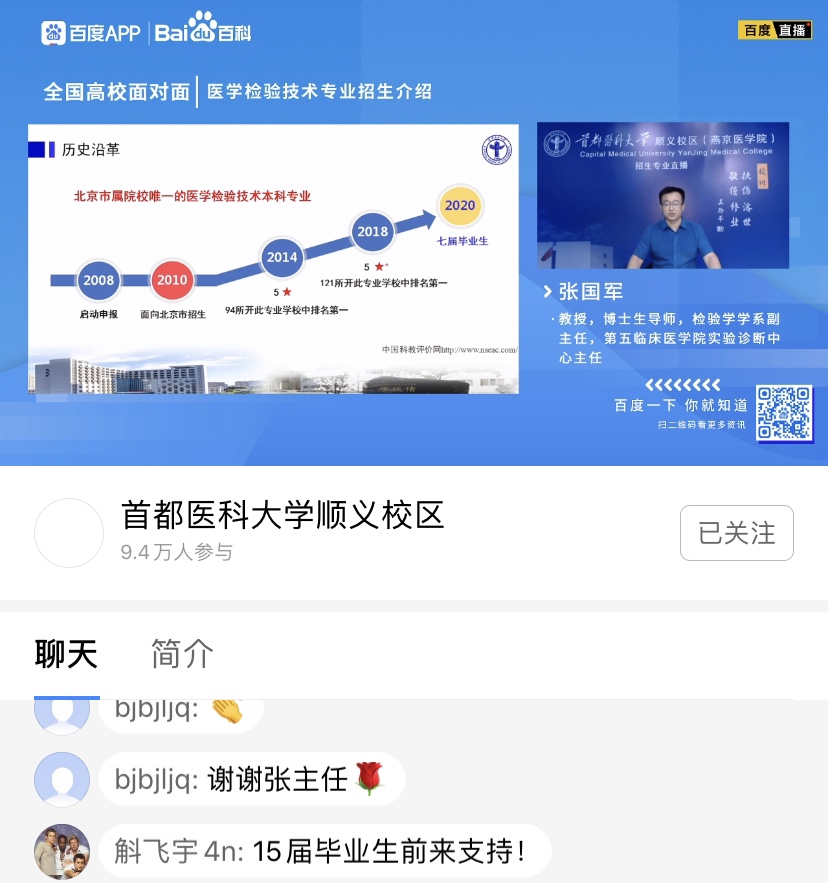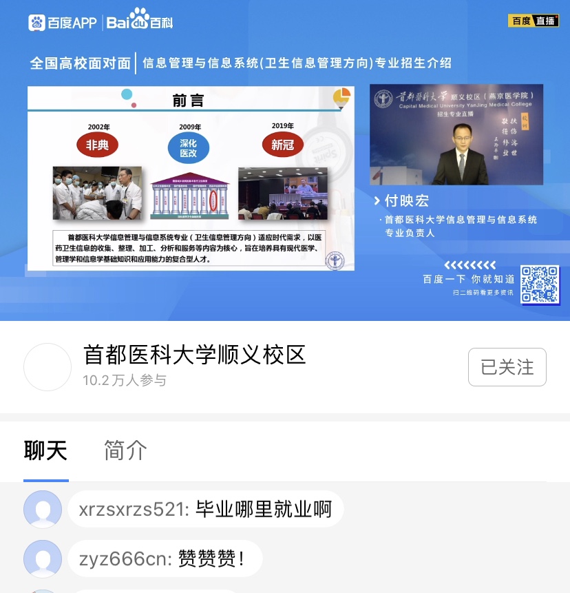 疫情特殊时期,我院应势而谋,把握网络媒体宣传主要阵地,通过网络直播宣讲的方式,积极宣传推介学院7个本科专业,突出专业内涵,吸引优秀生源。期待更多学子踏入医学殿堂,助力人民健康,为健康中国健康北京贡献力量。