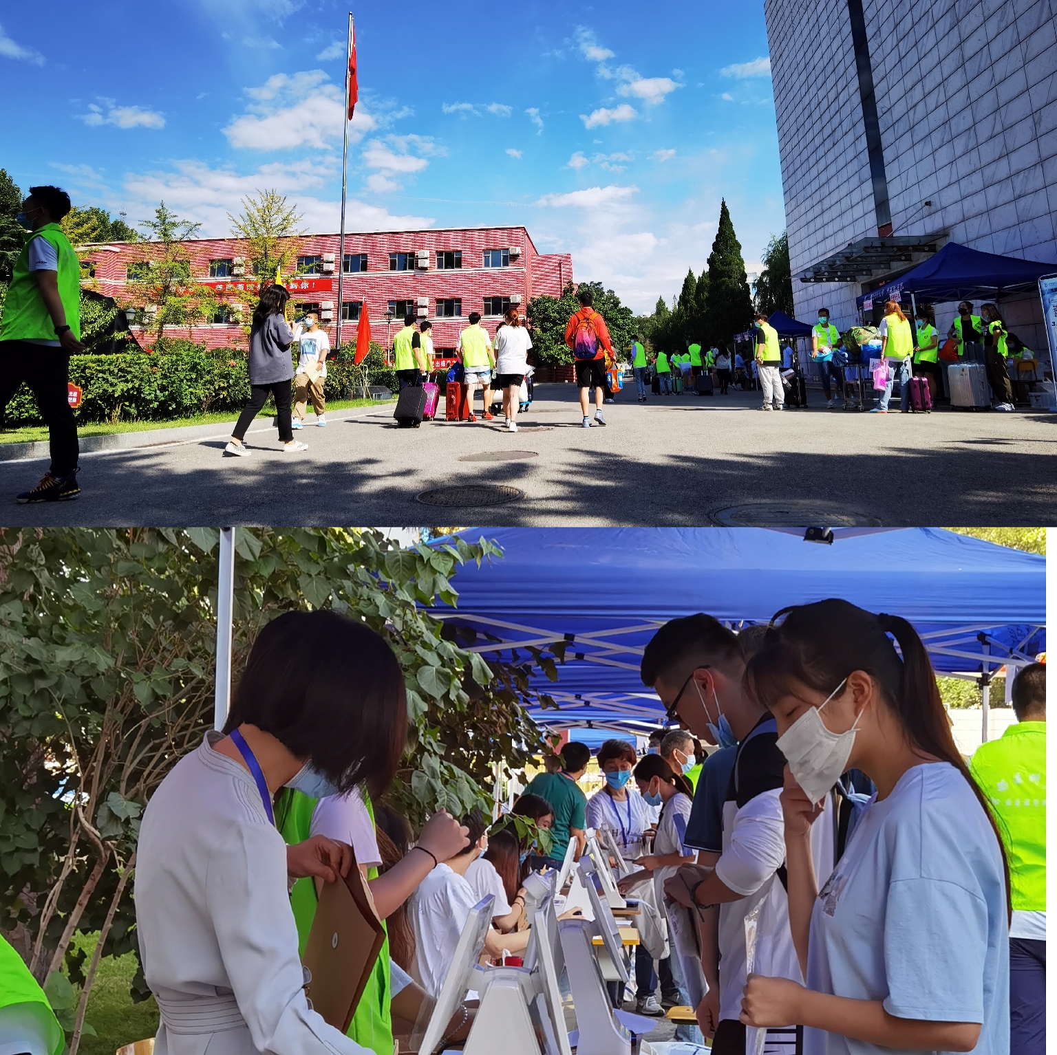 考虑到疫情防控的要求,送新生的家长不能入校,迎新现场的学生志愿者们身着绿马甲,化身“小超人”,穿梭在校园各个角落,帮助引导、搬运行李,全流程、不间断地为新生们送去最贴心的服务和最暖心的关怀。