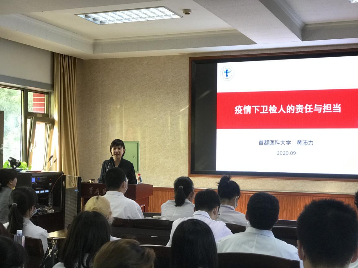 公共卫生学院黄沛力教授做题为《疫情下卫检人的责任与担当》的专题讲座,学院院长杨红和2020级检验学学系新生共同参加讲座,讲座由检验学学系主任高春艳主持。