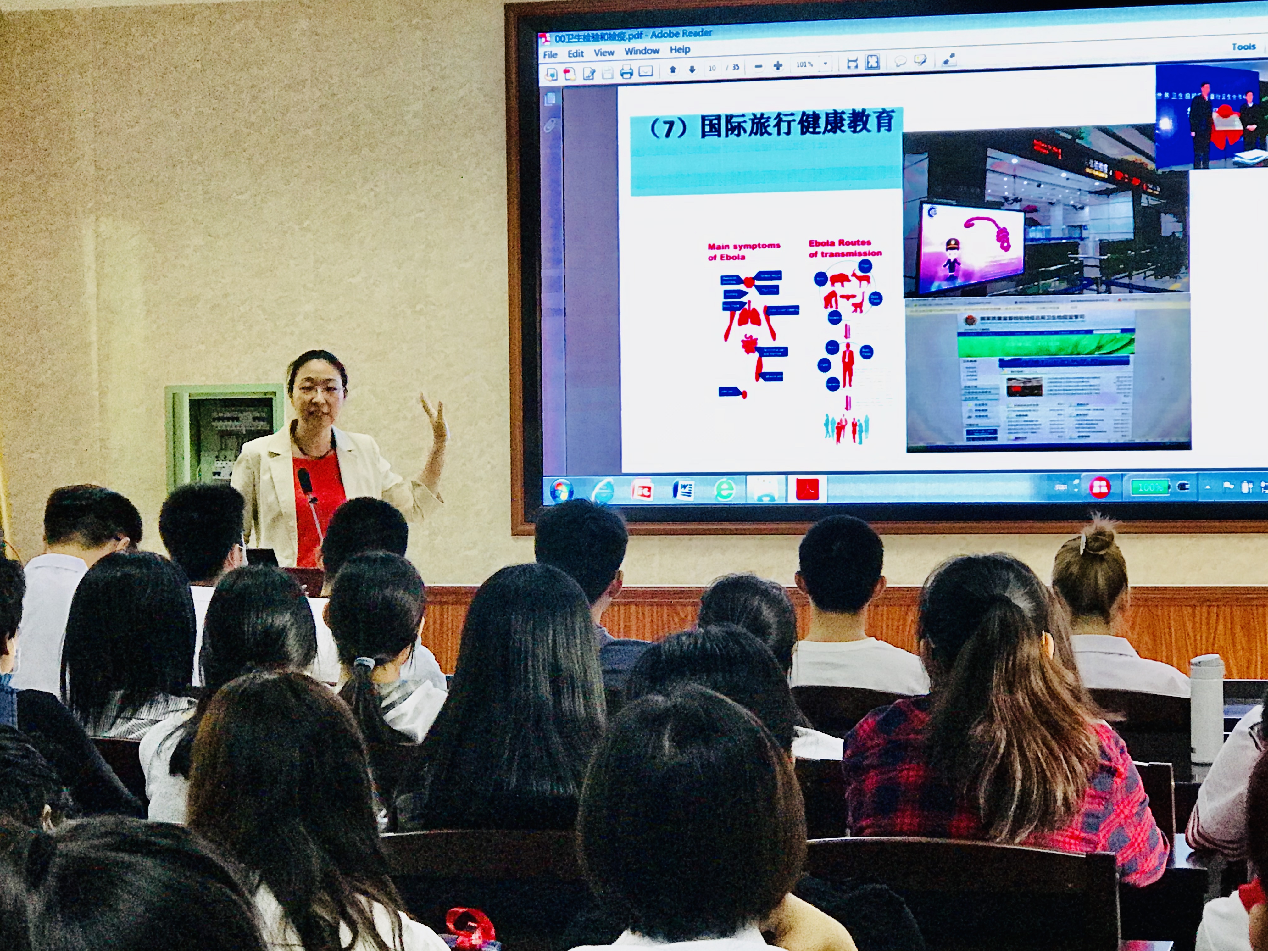 杨红院长总结发言,卫生检验检疫工作是守卫人们健康的特种兵,是严防传染病输入输出的国门卫士,并能影响国际贸易及老百姓生活的方方面面,希望大家树立远大的理想,将来成为卫检方面的优秀人才!