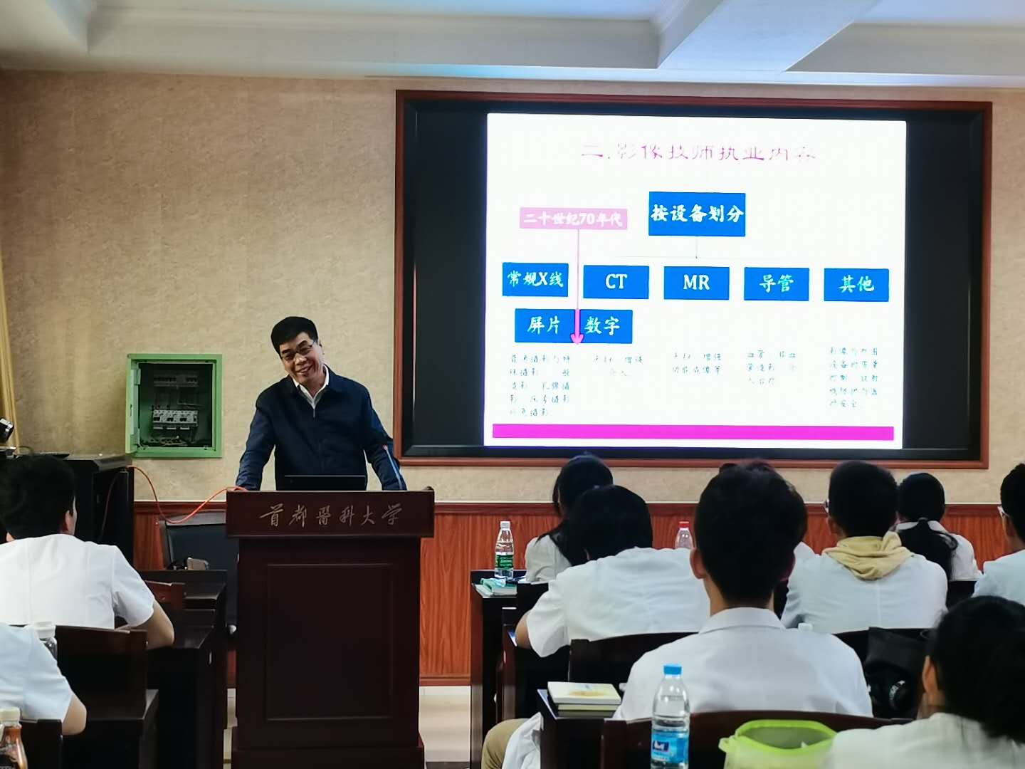 本次公开课以《医学影像质量控制与管理》为题,分为影像技师的职业内涵、影像技师的执业内容、医学影像质量管理相关概念、质量控制技师需要具备能力四部分。刘主任通过医院组织构架,医学影像科人员构成等医院实际工作情况介绍,让学生们了解到影像技师是操作医学成像设备,为诊断提供病人身体内部结构影像的技术人员。他强调,影像技师运用医学影像技术,与医师一起共同开展诊断、治疗工作,是医疗团队的重要组成部分,而其中的影像质量是精准医疗的基础。