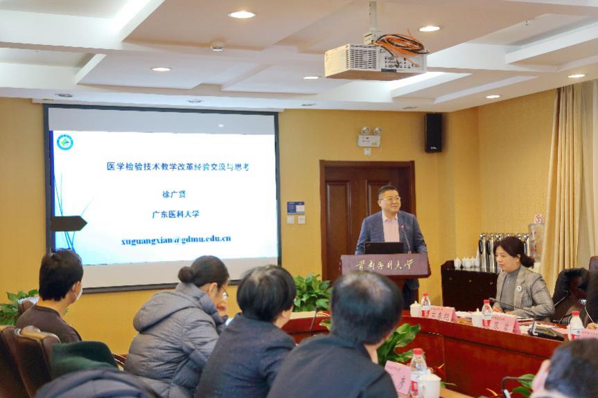 现广东医科大学徐广贤教授(原宁夏医科大学检验学院院长),分享了宁夏医科大学医学检验技术一流专业建设中的经验,包括在医学检验模拟实验室建设,数字化、网络化教学资源库建设,双师型师资队伍建设,“二强、六化、一产出”的实践教学模式等方面的教育教学改革经验和思考,并提出新冠疫情冲击和新医科背景下专业人才培养的矛盾所在和可行的应对策略。