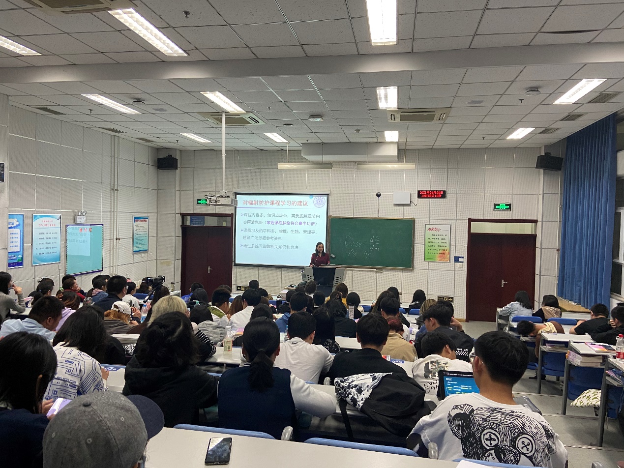 随后,邱睿教授还为同学们讲解了生活中的辐射来源、天然源以及人工源的年均剂量等,并深入介绍了自己在辐射剂量学方向的相关研究。对于医学影像技术专业的学生,邱睿教授还给出了一些关于放射防护课程的学习建议:同学们应当有综合性、发散性思维,将辐射防护知识融入到学科学习中,融会贯通。