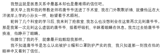 平行病历秉承叙事医学 “共情和反思”的理念,按照“有意思、有意味、有意蕴、有意义”的四有标准,以文学之笔,写临床之事。平行病历书写没有固定模式,除了医学基本功,更需要有人文的包容度和感情的注入。通过平行病历的书写,再现医患心灵的碰撞,凸显医学人文关怀。