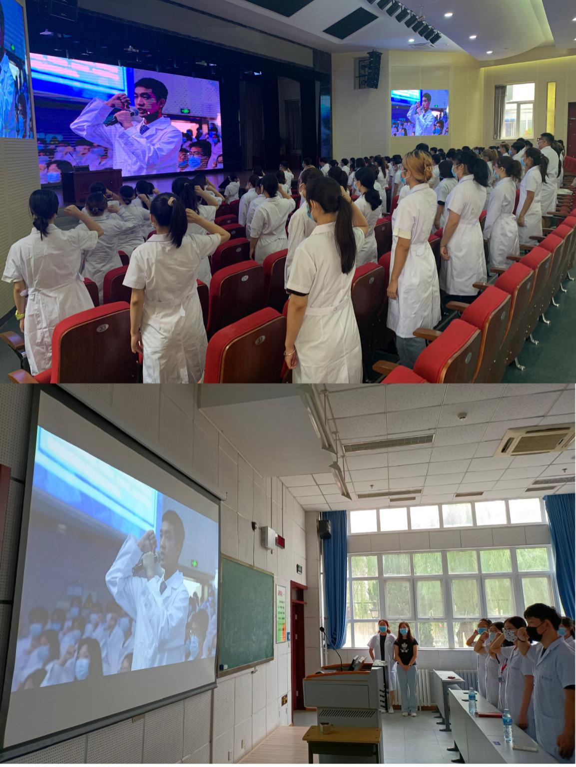“健康所系,性命相托……我志愿献身医学,热爱祖国,忠于人民,恪守医德………”在学院分会场的2021级新生身着白衣,高握右拳,与主会场同时庄严宣誓,洪亮且坚定的声音是在宣告他们要成为一名优秀医学生的信心和决心,要为祖国医药卫生事业的发展和人类身心健康奋斗终生的无悔和誓言。