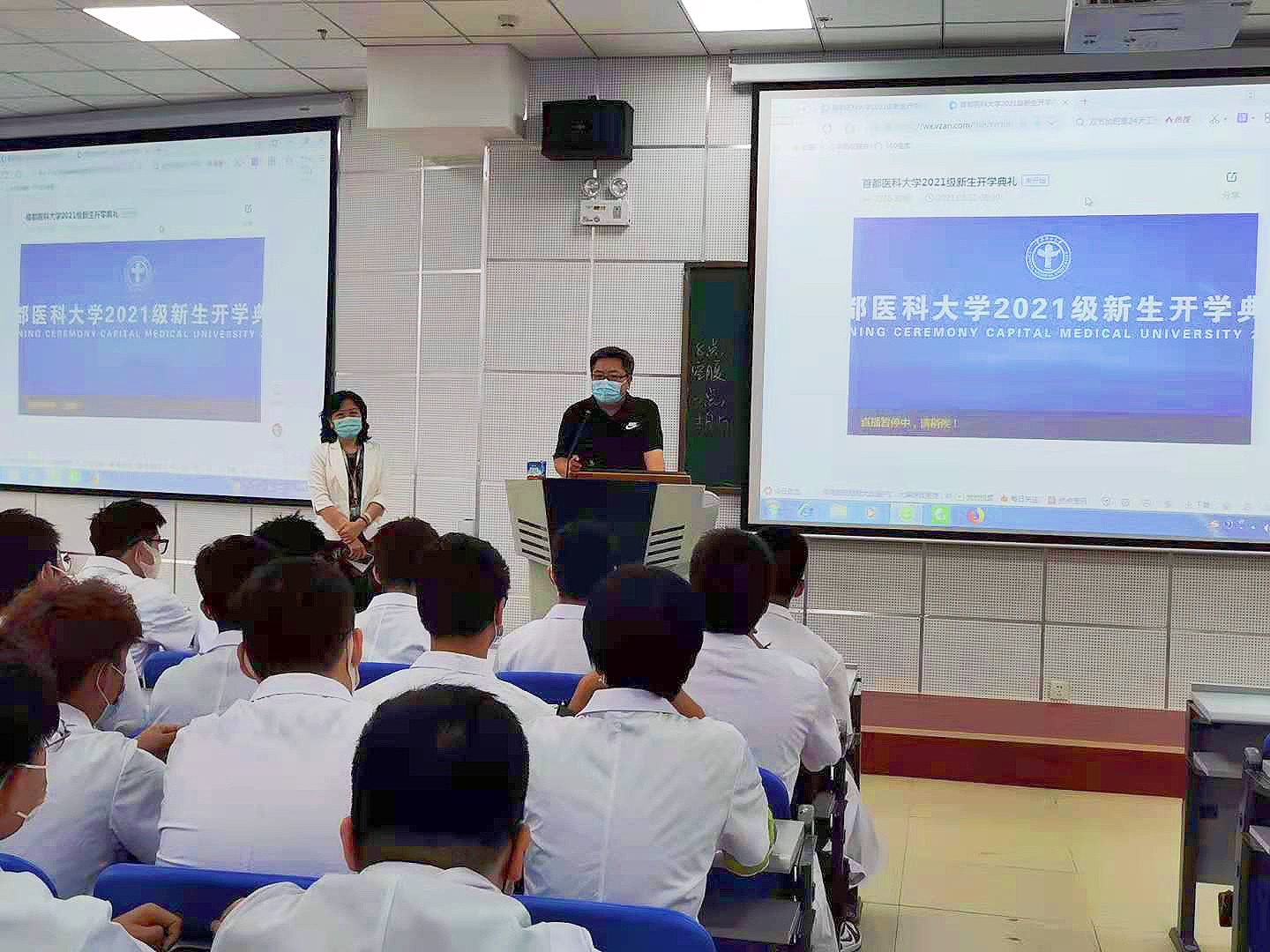 8 月31日上午9时,2021级新生开学典礼在学校学术报告厅举行。我院严格按照学校疫情防控工作要求,分别在学院报告厅、燕思楼301和各教室设观看直播分会场,学院领导、各学系党支部书记、学系主任、辅导员、兼职班主任以及全体分会场新生通过直播形式观看。