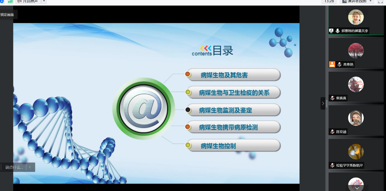 3月30日,北京海关科学技术研究中心卫生检疫研究所副研究员郭惠琳老师应邀举办题为”检疫学研究进展“的线上讲座,卫生检验与检疫专业2019级全体学生及学系教师聆听讲座,检验学学系主任高春艳主持。