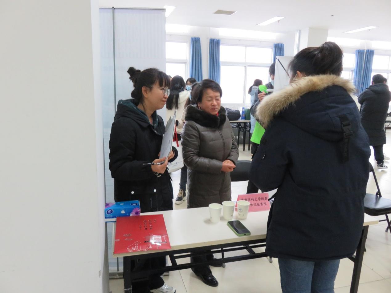 12月12日上午十点,在学院餐厅三层学生活动中心多功能大厅,七家医院如期就位。应聘学生手持自己精心准备好的简历,充满自信,积极和招聘医院工作人员交流,主动了解用人单位情况。本次招聘会共有近百名学生投递了个人简历,3家医院现场面试70余人次,现场达成就业意向20余人。上午,我院分管就业工作的崔群颖副院长到招聘会现场与各家医院招聘人员一一进行见面沟通,希望通过校院合作,加强联系,共同推进毕业生就业,同时满足医院用人需求。
