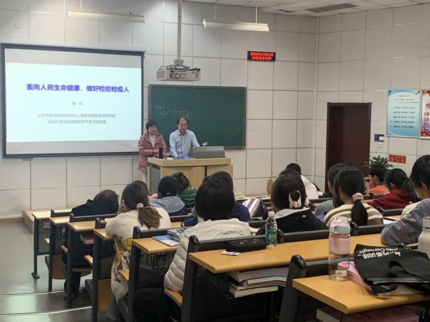此外,邵兵主任还为2024级和2023级的卫生检验与检疫专业及医学检验专业学生带来了一场题为“肩负人民生命健康使命,争做优秀检验检疫人”的专题讲座。他介绍了检验与检疫行业的特色与人才需求,为学生们规划大学学习生活提供了宝贵建议。同时,结合中心实验室的科研实践经验,邵主任详细阐述了检验与检疫行业的工作内容与职责。他以“面向人民生命健康”的行业使命为引领,鼓励学生们提前规划职业生涯,不断提升专业技能和综合素质,为未来考研深造或投身检验与检疫事业奠定坚实的基础。