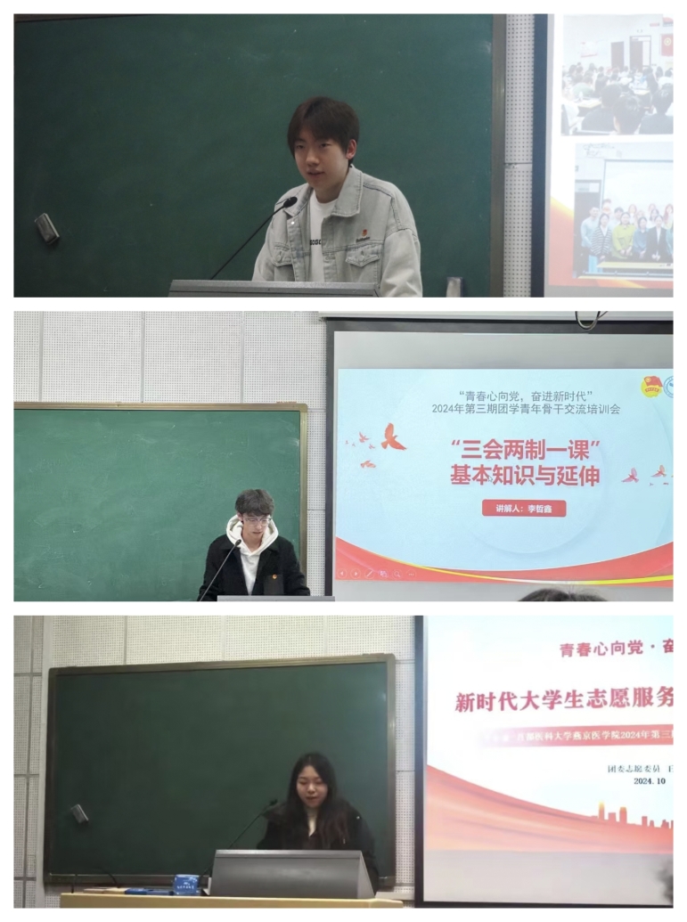 本期交流培训会围绕“团支部工作经验分享和团务工作培训”展开。在“经验分享”环节,21影像张珏雅、22急救辜心宝、22卫检赵清锶、23预防齐昱博、23影像崔梦娇5位优秀团支书,从团支部工作开展经验、工作创新点以及个人工作技巧等方面向新生团干部进行讲解、展示,激发他们对团支部工作的热情和立志将工作“做好、做新、做出彩”的决心。