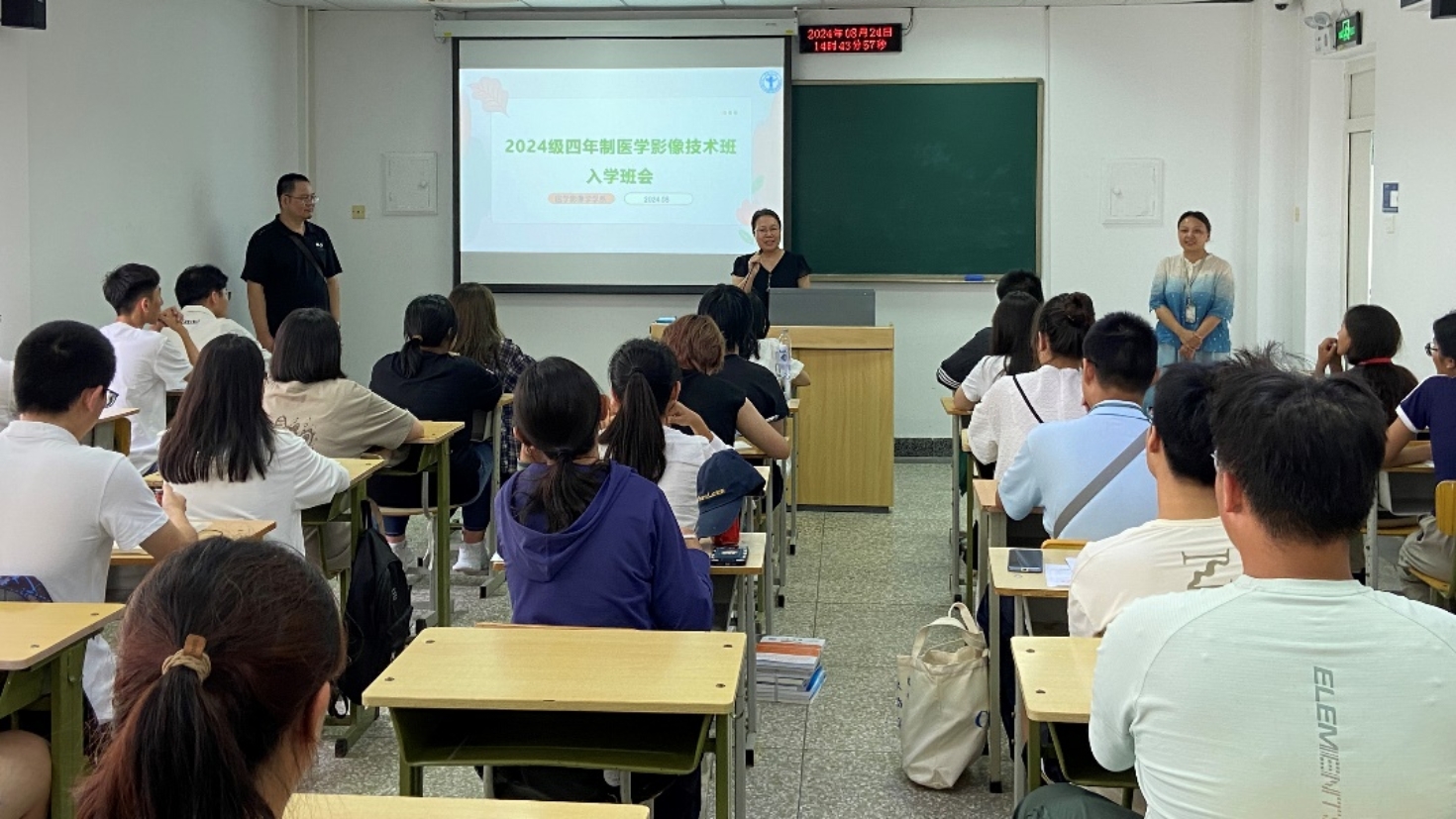 仲秋时节,骄阳似火,医学影像学学系迎来了充满活力的2024级新同学。24日下午,新生入学班会在燕谨楼303教室举行,学院党委副书记赵艳芝,医学影像学学系党支部书记、系主任胡玲静,班主任胡贵祥老师出席此次班会,班会由辅导员许冰洁主持。