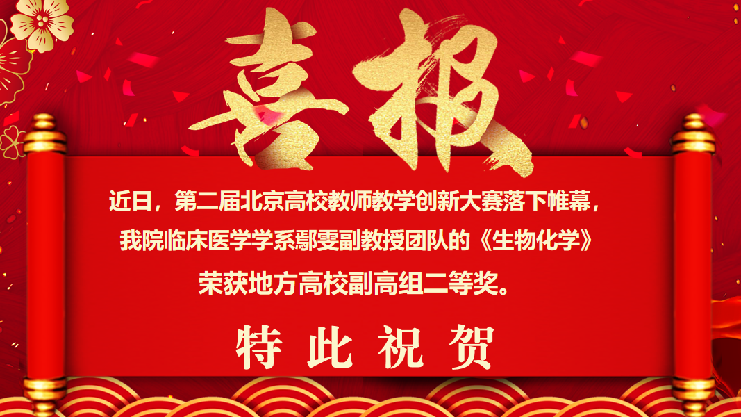 近日,北京市教育委员会举办的“第二届北京高校教师教学创新大赛”落下帷幕,我院临床医学学系鄢雯副教授团队的《生物化学》荣获地方高校副高组二等奖。