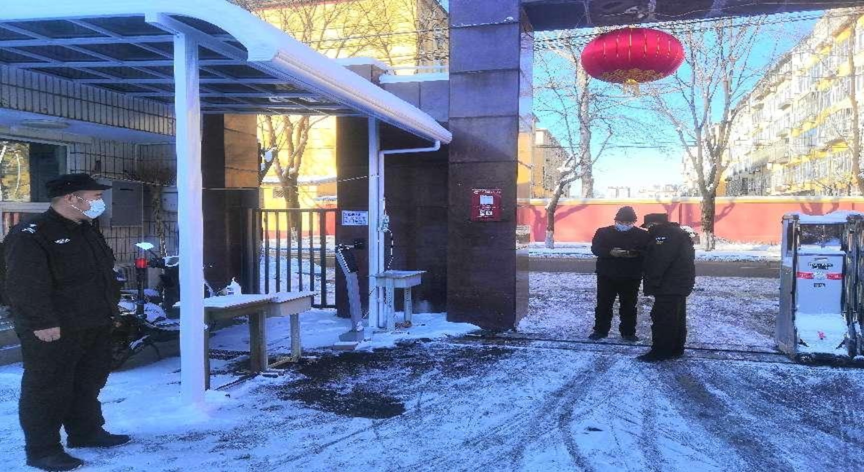 疫情防控没有假期,学院保卫人员在暴雪天气依然坚守岗位,对入校人员及车辆进行核验备案。