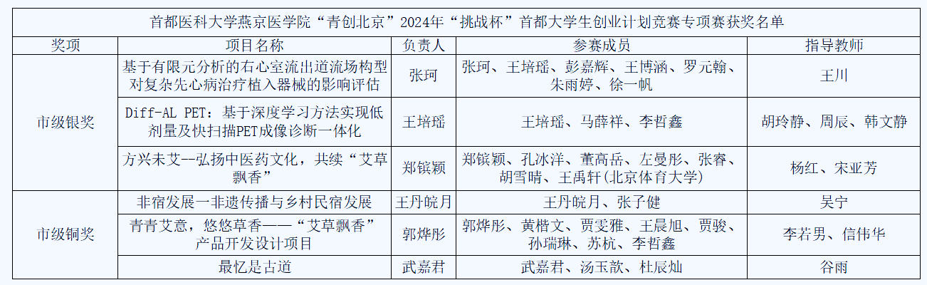 近日,在共青团北京市委员会、北京市教育委员会、北京市科学技术协会、北京市学生联合会主办的“青创北京”2024年“挑战杯”首都大学生创业计划竞赛中,我院学生提交的作品在专项赛作品评选中共获得6项大奖,其中,市级银奖3项,市级铜奖3项。