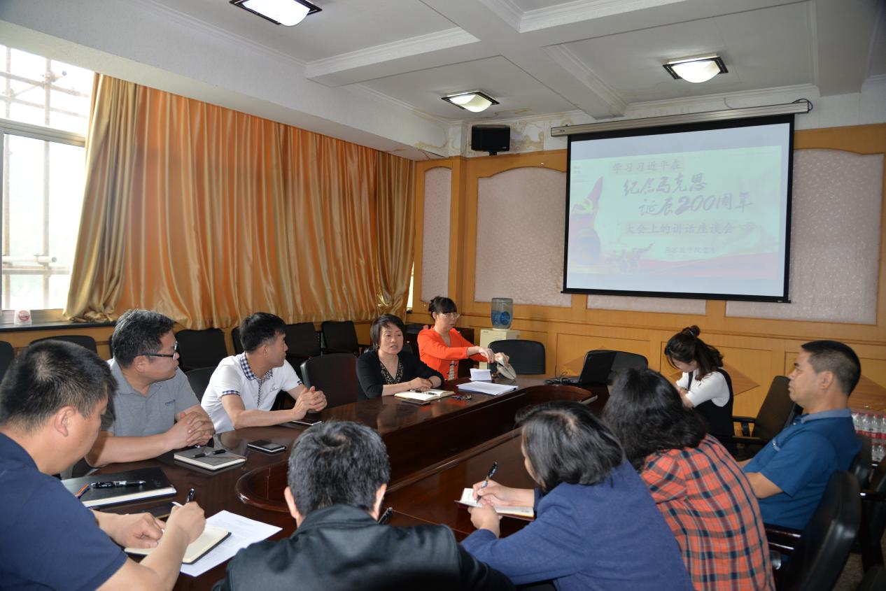 为深入学习马克思思想,领悟马克思主义真理的力量,2018年5月10日上午,Hanime1 党委召开学习习近平在纪念马克思诞辰200周年大会上的讲话座谈会,学院人文思政教师参加座谈会,学院党委书记吴兵,党委副书记汤海新出席。座谈会由学院党委副书记崔群颖主持。