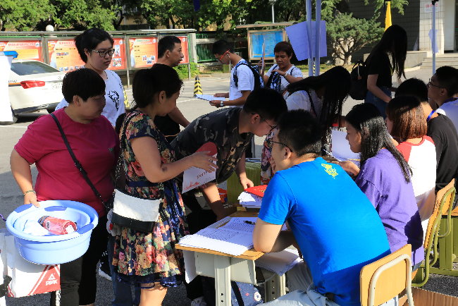 七点刚过,来自北京各区县的新生陆续走进校园。吴兵书记、杨红院长、崔群颖副书记到新生报到现场指导工作,慰问一线工作人员,并与学生家长进行亲切交流。在学院门口、篮球场上,相关职能部门和各专业都设有独立的迎新棚,确保新生报到工作有序进行。现场安保人员、学生志愿者时刻巡逻以维护秩序和安全,同时还为家庭贫困学生设立的绿色通道,方便贫困学生正常入学。新生报道从信息检录到入驻宿舍的每一个环节,都有训练有素的志愿带领、帮助,。在各部门和全体迎新师生密切配合、齐心合力下,整个迎新过程安全、有序、热情、周到、高效,让学生充分感受到学校的温暖和关爱。下午三点左右,新生基本都报到完毕。随后,院领导一行走访了新生宿舍,详细了解新生入住情况。