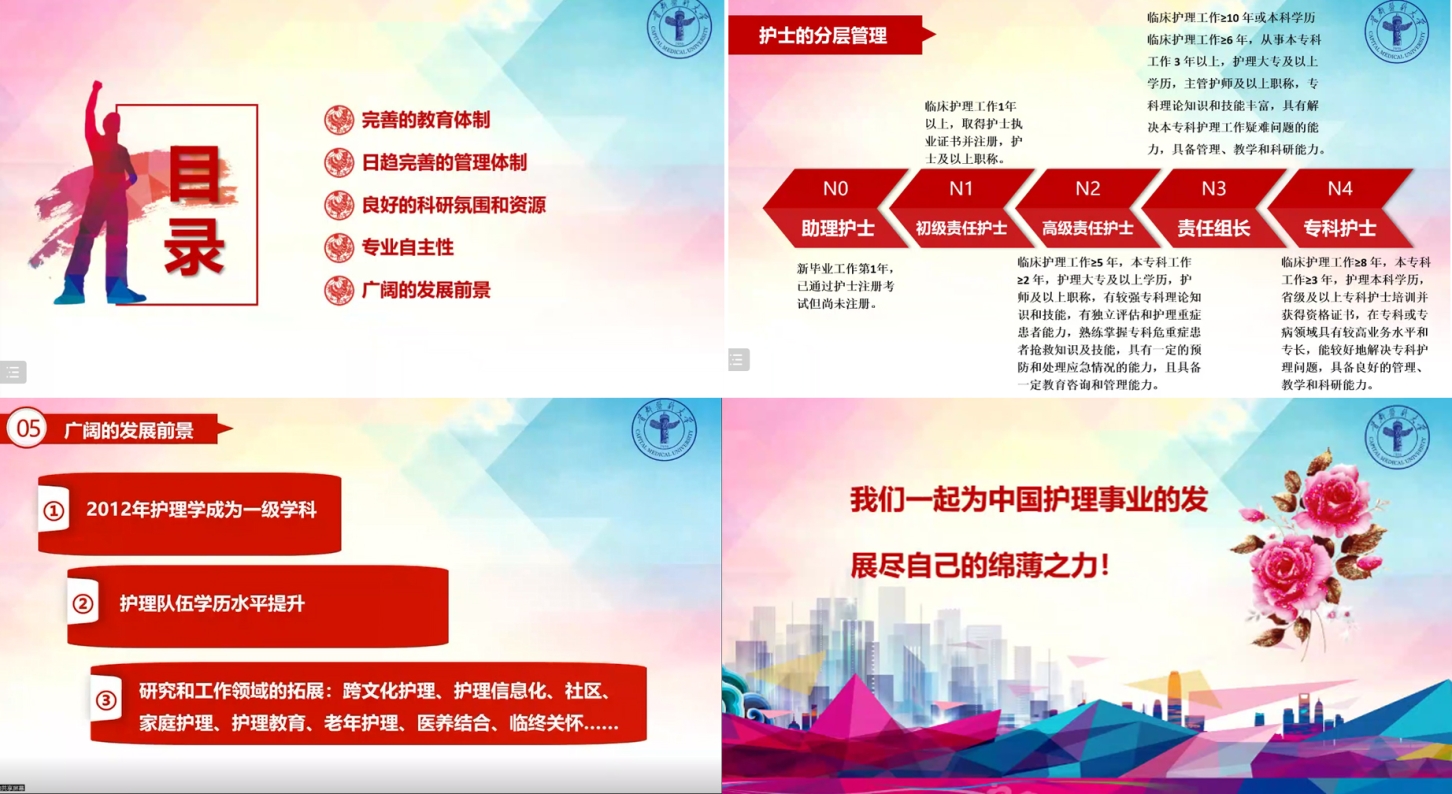 学系副主任许燕老师从完善的教育体制、日趋完善的管理体制、良好的科研氛围和资源、专业自主性、广阔的发展前景等五个方面,向学生介绍了护理学的发展现状与前景,并强调了科研的重要性,鼓励学生不要以本科为终点,要不断进取,更积极地向上攀登。