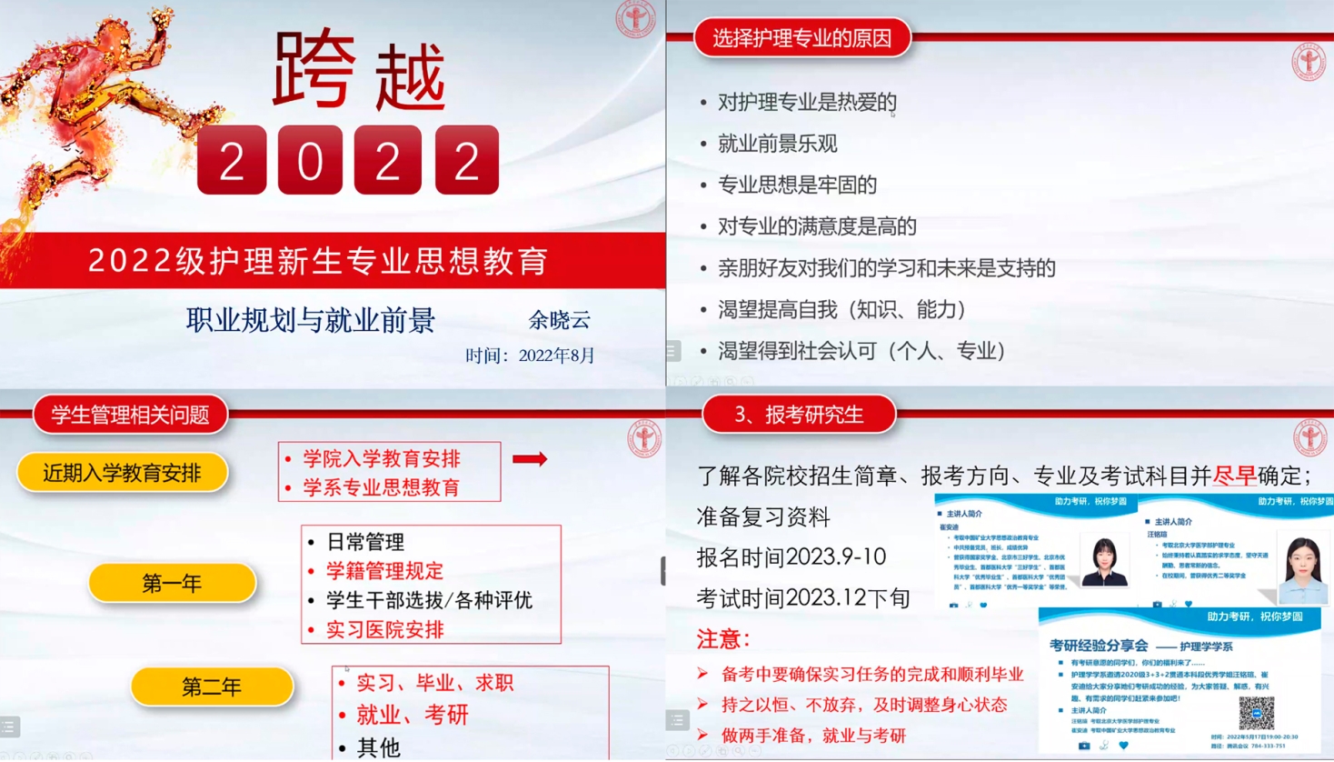 为帮助新生加深对护理专业的认识和了解,增强专业认同感,明确专业培养目标,及早做好学业生涯规划,8月21日上午,学系举办了“2022级护理学学系新生专业思想教育”活动。根据当前疫情管理要求,为避免人员聚集,此次活动以线上会议的形式举行。护理学学系主任邵广宇老师、党支部书记余晓云老师、副主任许燕老师和肖焕新老师及学系辅导员老师、兼职班主任和2022级护理学学系全体新生参加了此次会议。