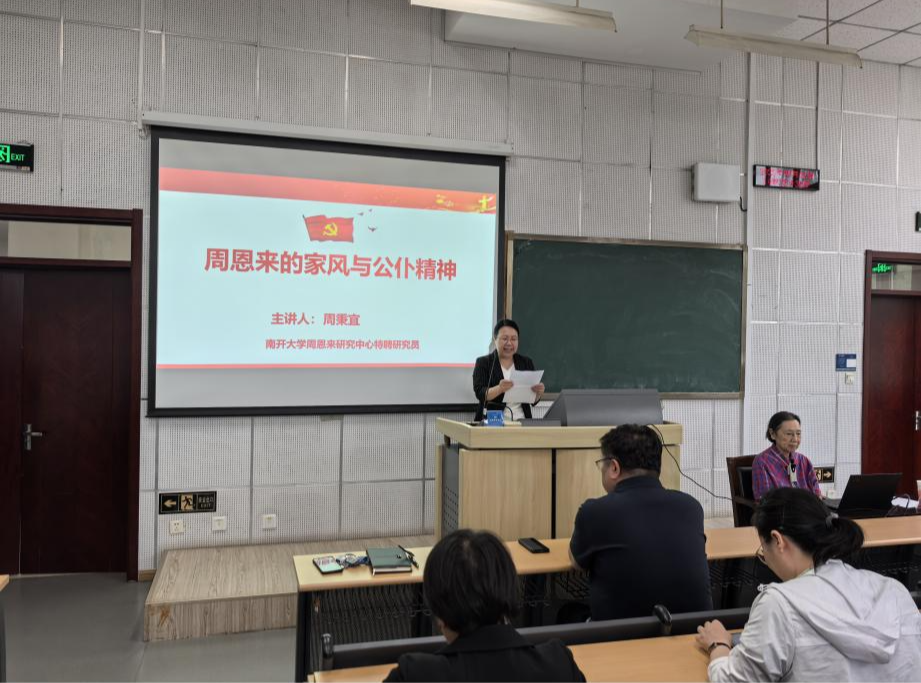 为深入学习贯彻中央八项规定精神,传承和弘扬老一辈革命家的优良家风,加强党性修养和作风建设,5月22日下午,学院人文讲堂特邀请中央文献研究室周恩来研究会常务理事、南开大学周恩来研究中心特聘研究员周秉宜来学院作“周恩来的家风传承与公仆精神”专题报告。学院领导班子成员、中层干部及师生代表200余人聆听了讲座。本次讲座由学院党委副书记赵艳芝主持。