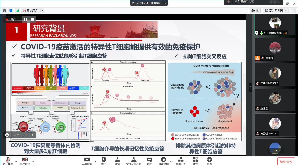 之后,汪川教授介绍了自己进行的SARS-CoV-2 Spike蛋白B细胞和T细胞表位肽的鉴定及在人群检测中的应用以及结核潜伏感染两项相关研究,介绍了相关科研成果和应用,重点介绍了在疫苗研制以及疫苗保护力检测等关于卫生检验在传染病防控中的具体应用。