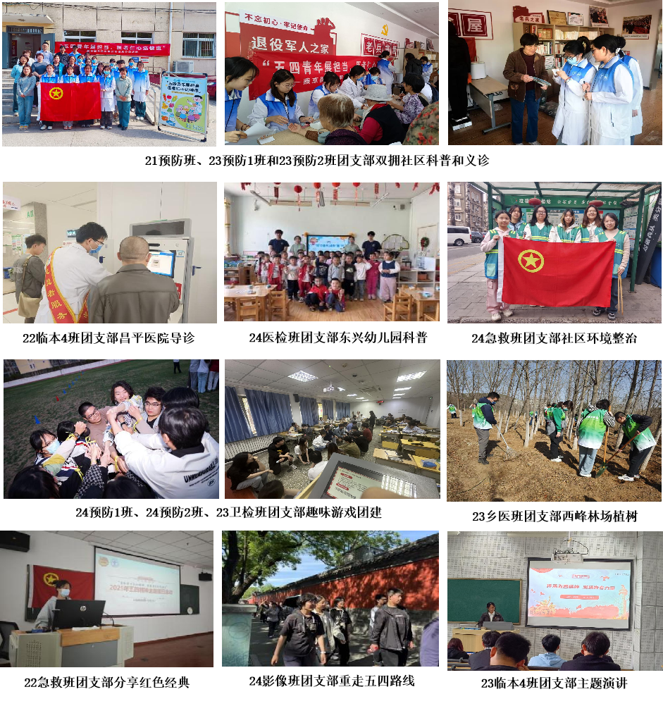 有的团支部以学促行,带领青年们积极投身社会实践,用行动诠释五四精神。在双拥社区义诊、昌平医院导诊、东兴幼儿园科普活动中,青年志愿者以专业知识传递医者仁心;参与社区环境整治、西峰林场植树,彰显服务社会的责任担当;趣味游戏团建增进了团队凝聚力,提升协作能力;分享红色经典、重走五四路线、开展主题演讲等活动,则激发了青年们的爱国情怀,坚定理想信念。