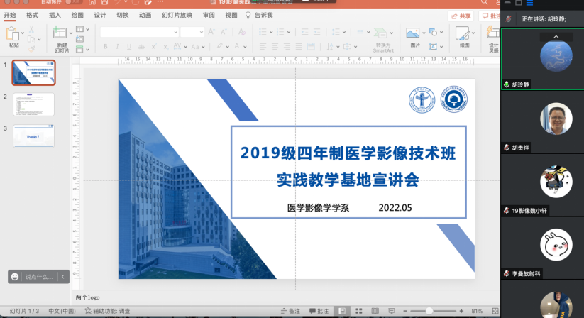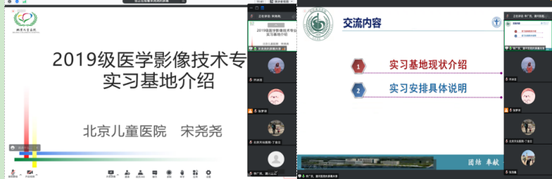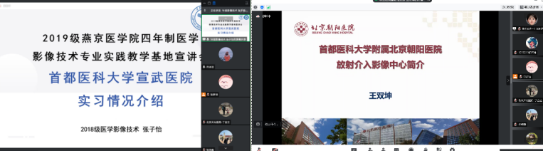为加深即将进入临床实习阶段的19级四年制医学影像技术专业学生对实践教学基地的全面了解,更好地开展实习和毕设工作,医学影像学学系于5月23日召开了实践教学基地线上宣讲会,7家实践教学基地应邀参加。北京朝阳医院放射科主任杨旗、副主任王双坤,干事杨志安、李曼,北京同仁医院医学影像中心技师长牛延涛、干事刘丹丹,以及分别来自北京儿童医院、北京潞河医院、北京天坛医院、宣武医院和北京友谊医院的干事宋尧尧、李广民、丁金力、苏壮志、吴柯薇,学院党委副书记赵艳芝,学系主任胡玲静,副主任董建鑫、胡贵祥,班主任张梦诗、辅导员许冰洁、学系部分老师及19级全体同学出席本次活动。