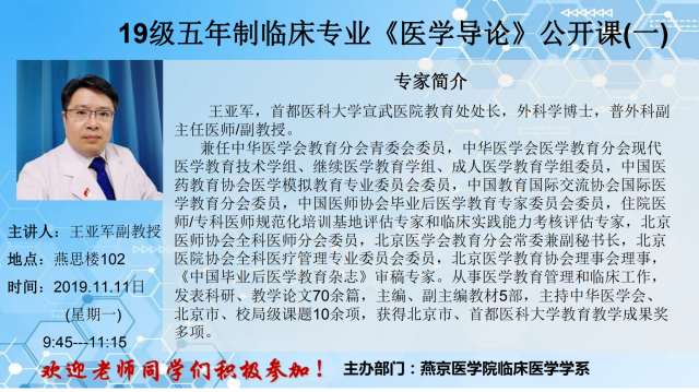 王亚军教授五年制临床专业《医学导论》公开课的通知