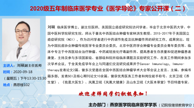 刘硕 博士“医学导论”公开课(一)的通知