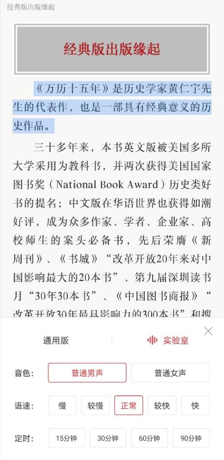 看书时轻点屏幕中央,点击右上角的“耳机”即可听书,推荐使用 实验室版 普通男声/普通女声,该页面也可设置语速、时间。