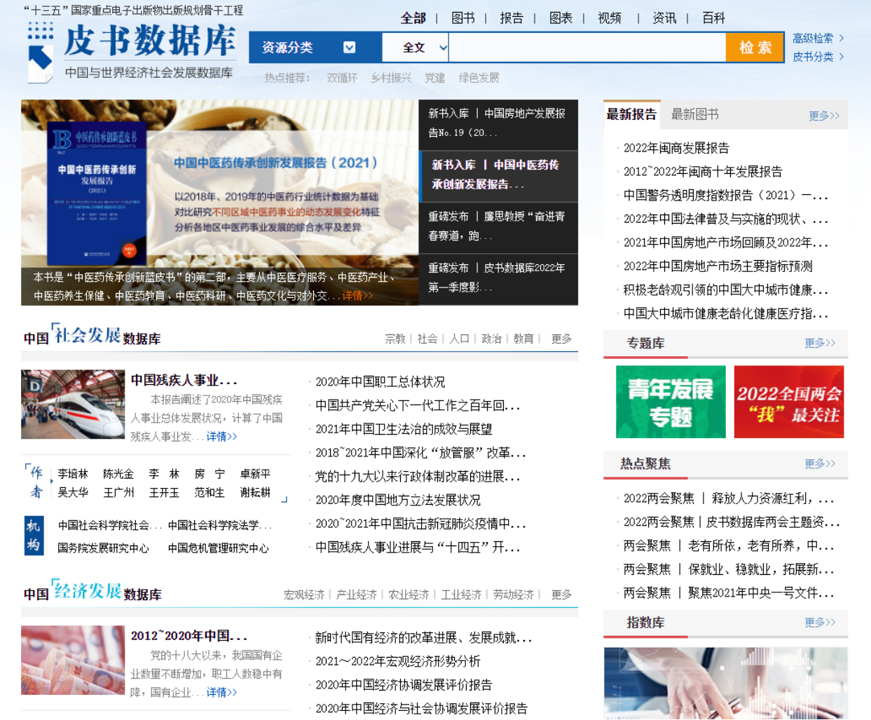 皮书数据库以“皮书系列”为基础,主要涉及分析解读当下中国发展变迁的专业著作、智库报告、学术资讯、调研数据等,面向高校图书馆、科研机构、社会大众提供教学科研、学科建设、社会生活指导等服务。